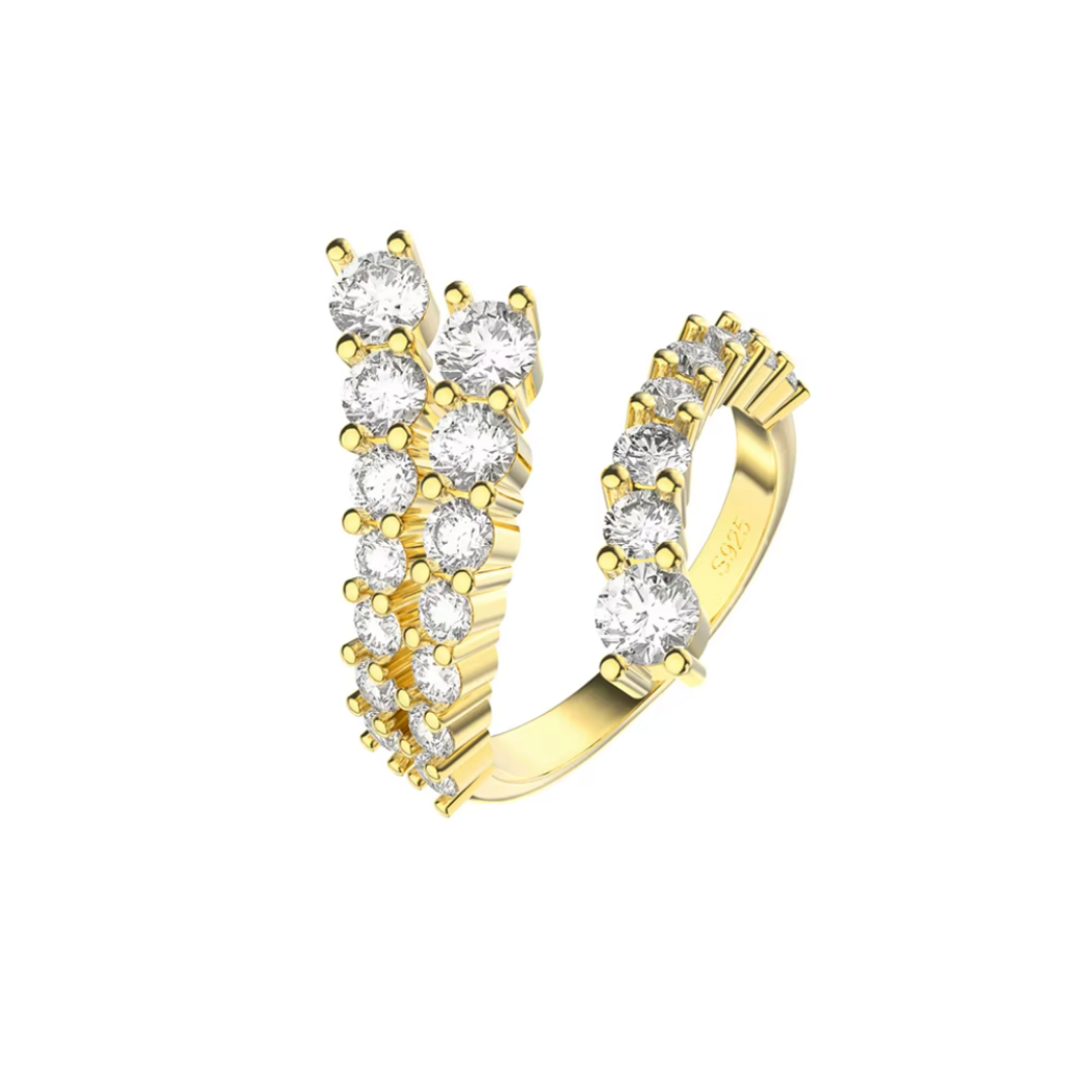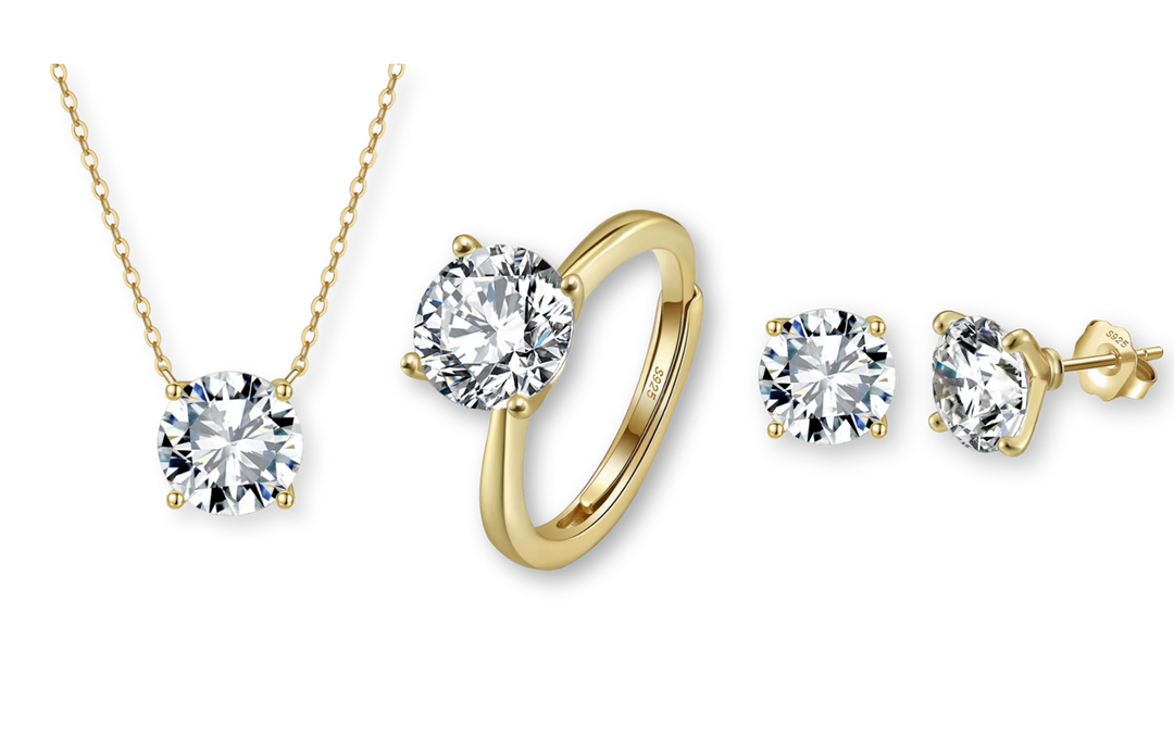 This exquisite 3-piece set includes a solitaire necklace, matching adjustable ring, and stud earrings — each crafted in 14K gold-plated 925 sterling silver with brilliant-cut stones that capture light from every angle.